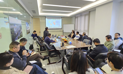 研究院首席科学家王庆中与三亚河水治理工程人员讨论硅藻河水治理技术。