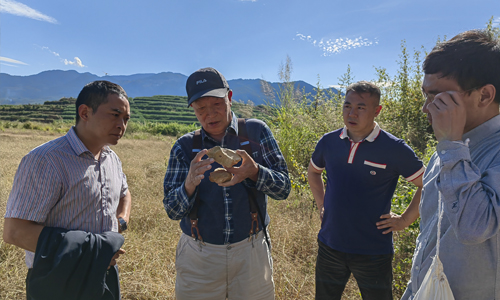 研究院首席科学家王庆中在云南硅藻矿现场给当地政府及考察团讲解硅藻矿特征。