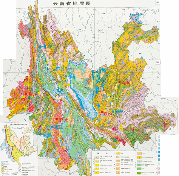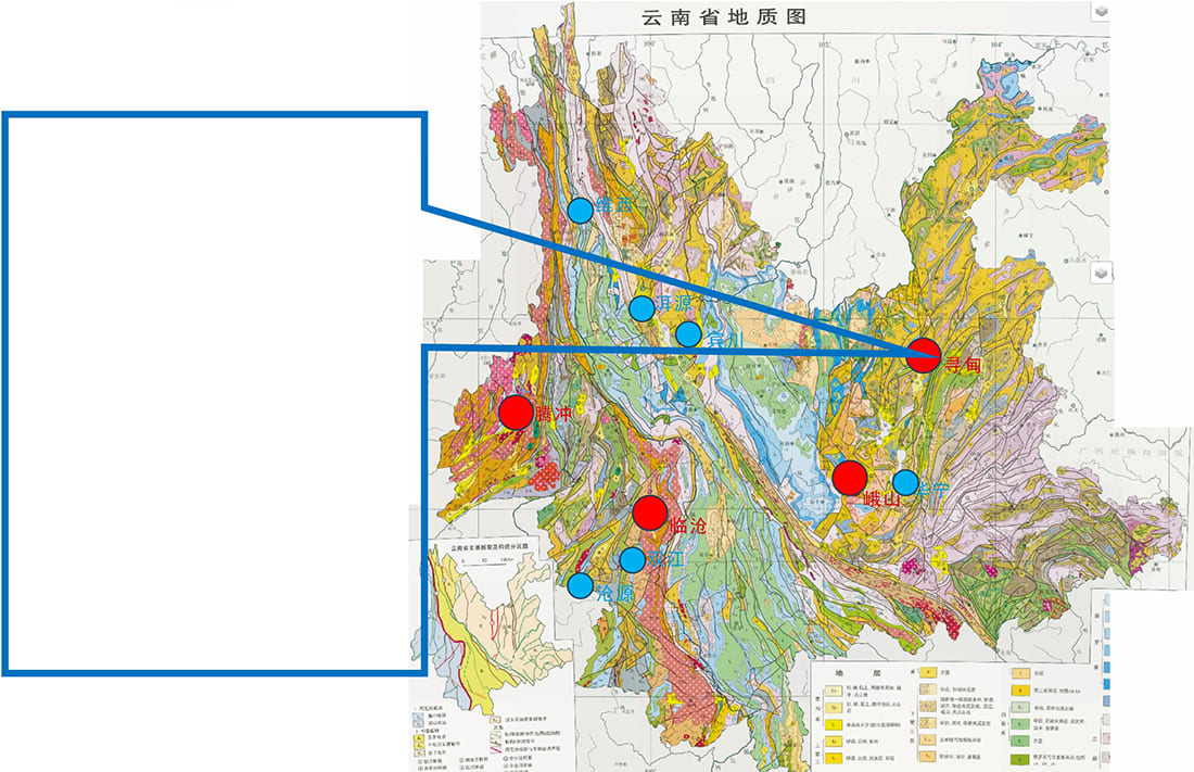 矿床(点)分布于金沙江大断裂和小江大断裂西侧地带,包括维西小马厂、洱源铁甲、寻甸邓家村、寻甸先锋和峨山小街等矿床(点)。